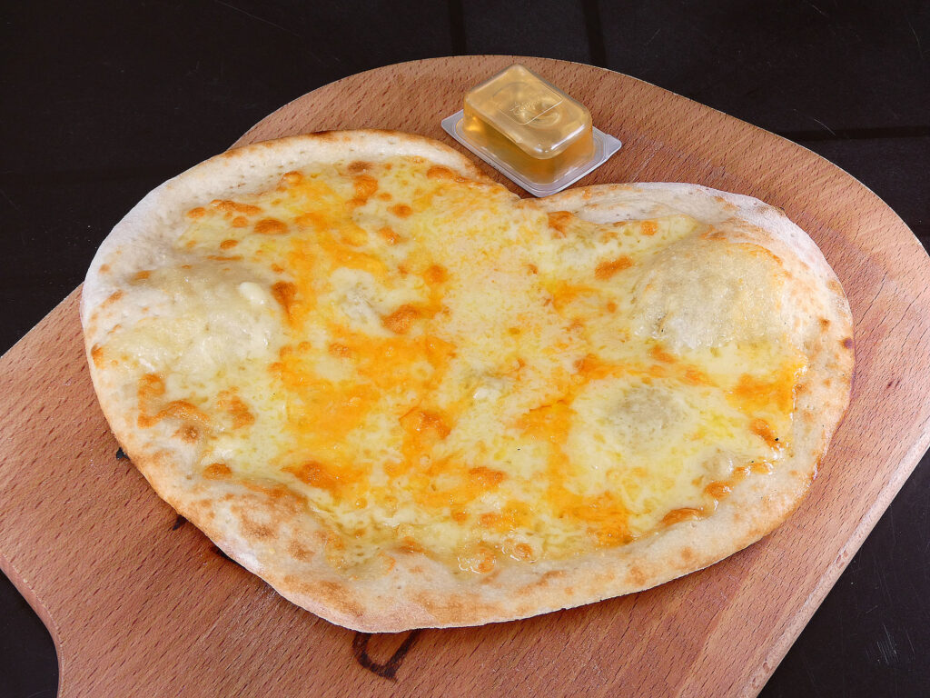 可愛らしいハート型に仕上げます。栃木県産小麦「ゆめかおり」をはじめ3種類の小麦粉をブレンドしたオリジナルの手作り生地です。大きさ約22cmです。お持ち帰りも出来ます。