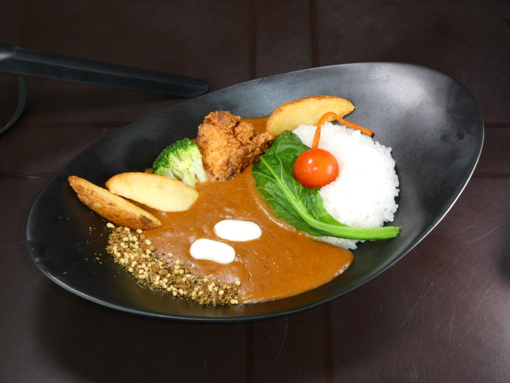 茶臼岳をイメージしてデザインしたプレート。ヨーグルトをカレーに浮かべてマイルドに仕上げました。
