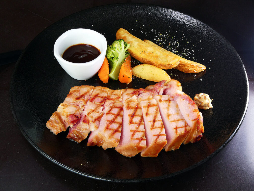 サーロインステーキをミディアムに焼き上げます。ジューシーなお肉をお楽しみください。ブルスト付きでボリュームも満点です。
