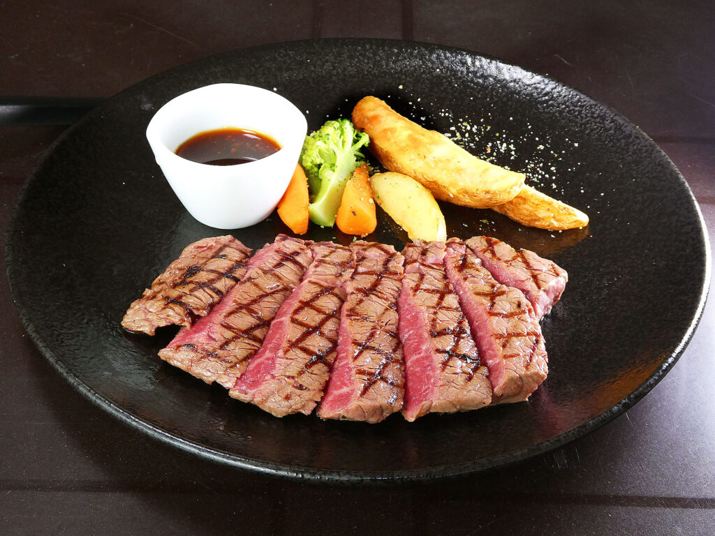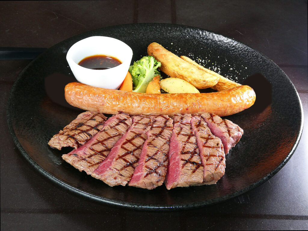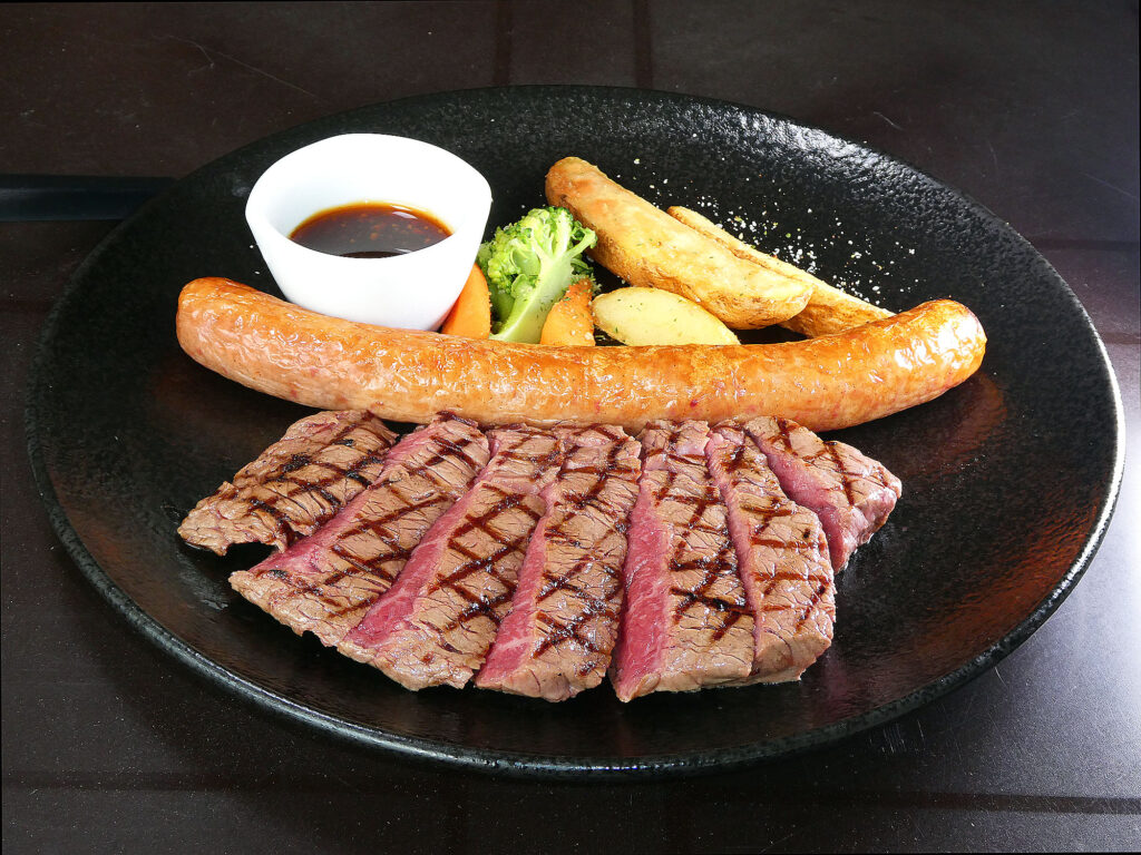 那須高原和牛のサーロインステーキをミディアムに焼き上げます。ジューシーなお肉をお楽しみください。ブルスト付きでボリュームも満点です。